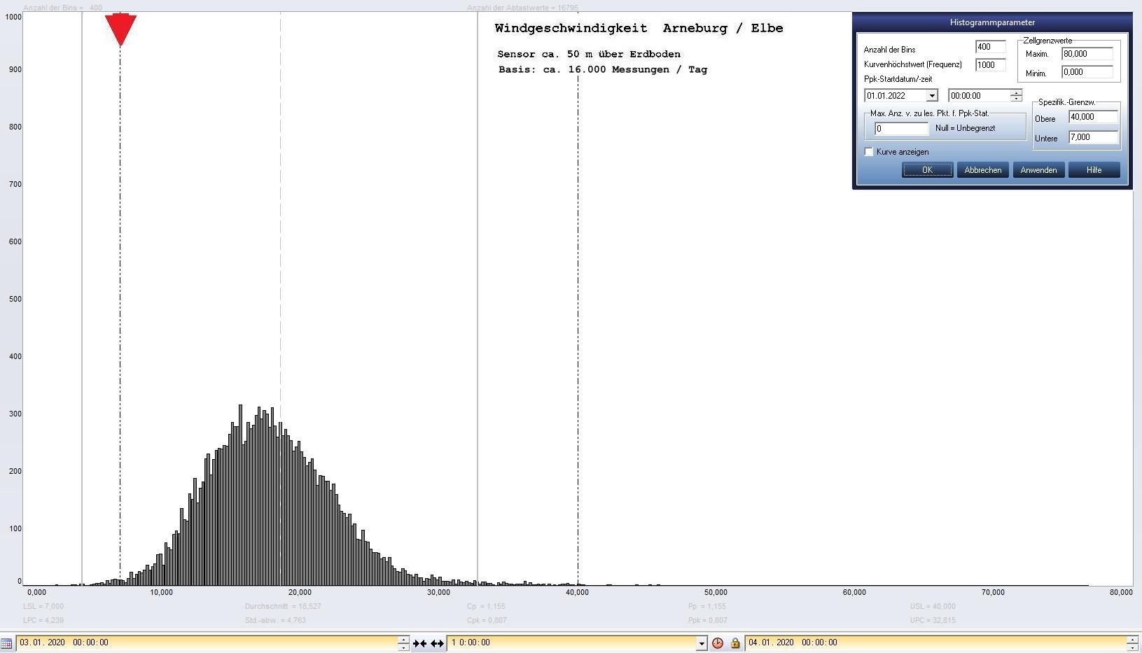 Arneburg Tages-Histogramm Winddaten, 03.01.2020