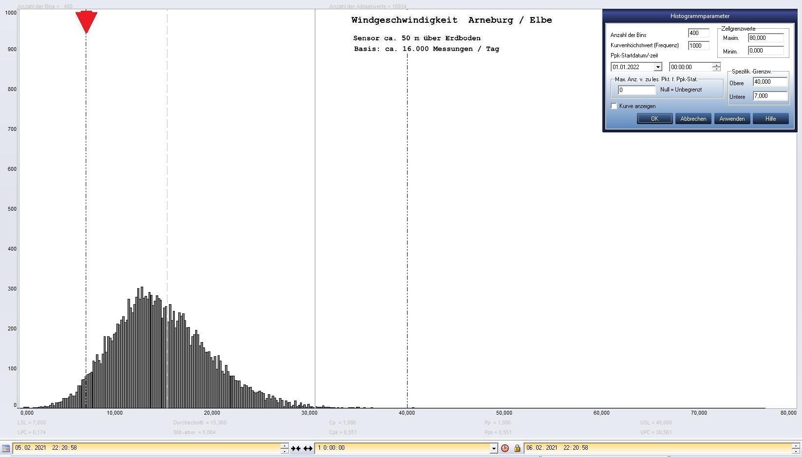 Arneburg Tages-Histogramm Winddaten, 22.02.2021