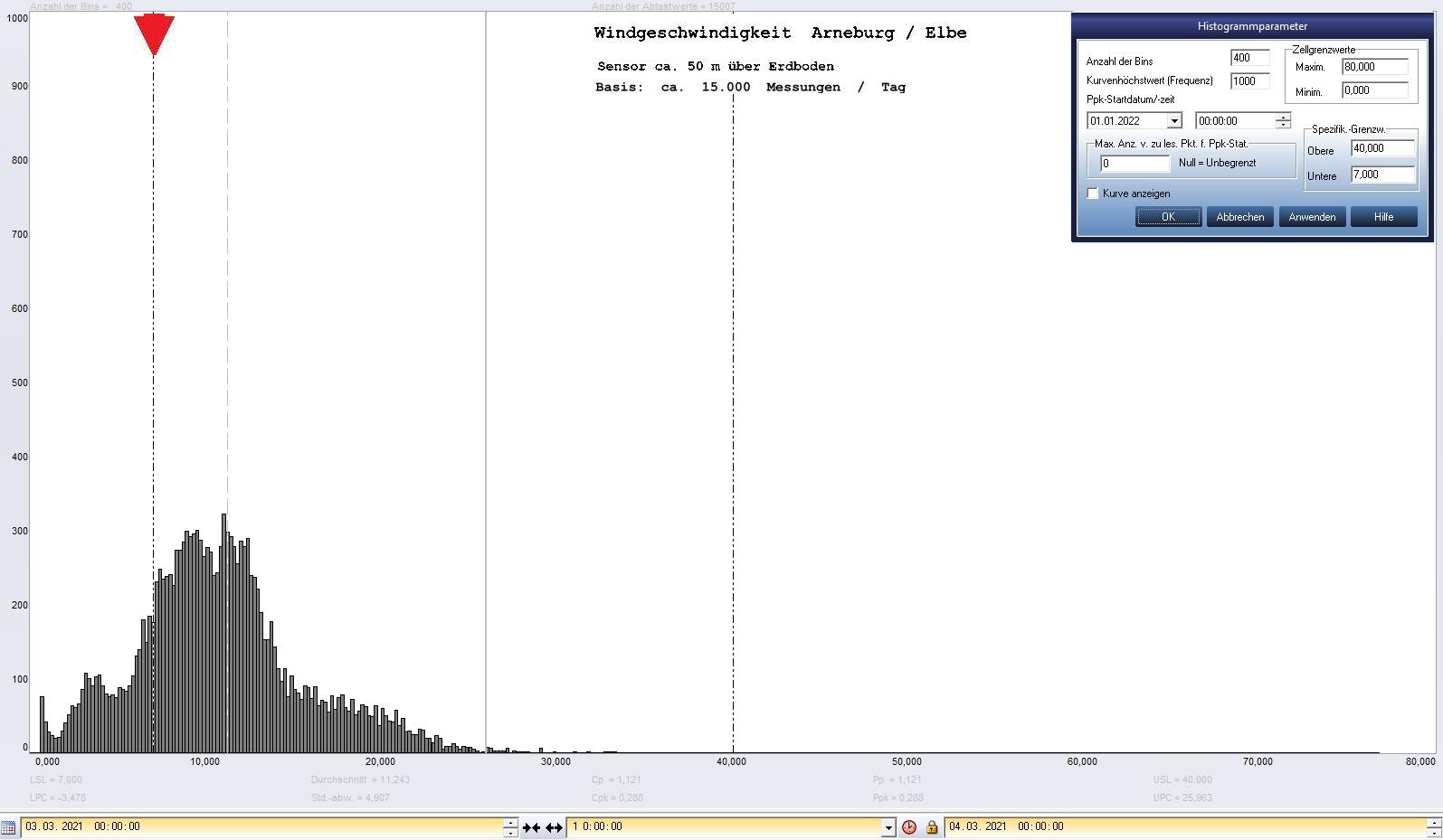 Arneburg Tages-Histogramm Winddaten, 03.03.2021