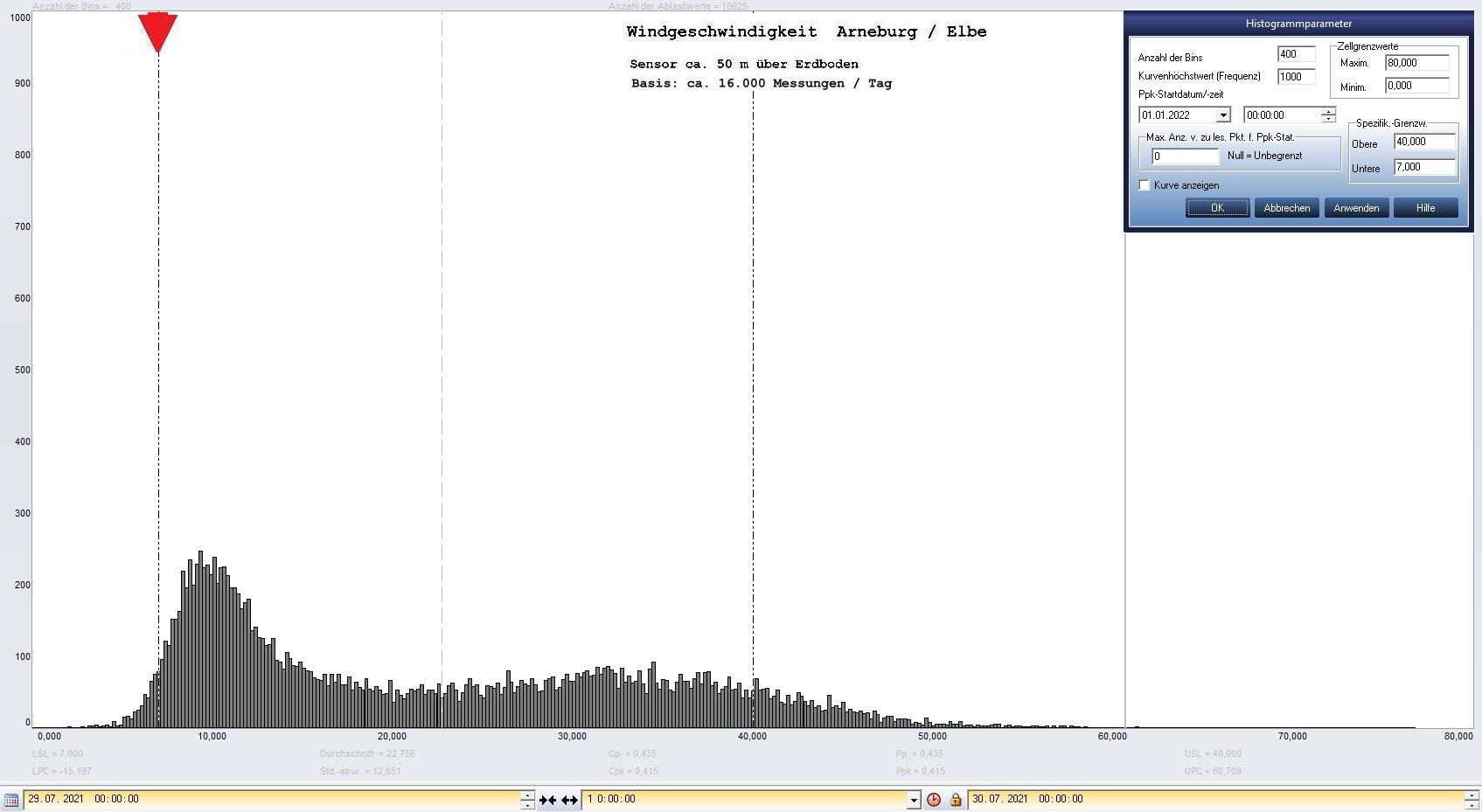 Arneburg Tages-Histogramm Winddaten, 30.07.2021
