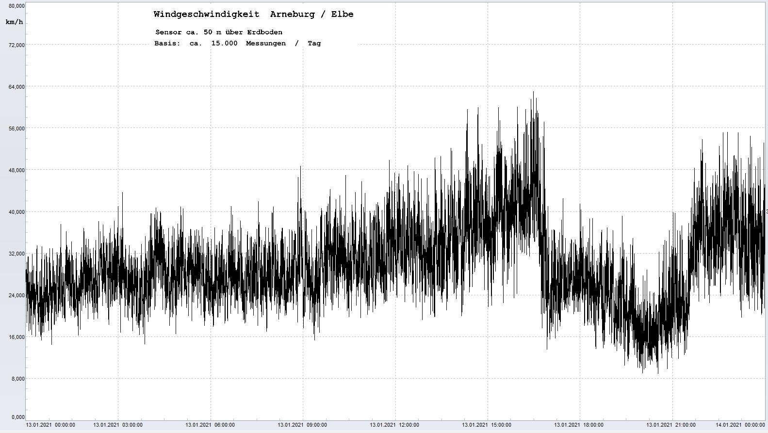 Arneburg Tages-Histogramm Winddaten, 13.01.2021