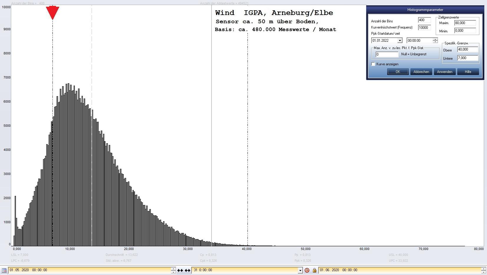 Arneburg Histogramm Winddaten Monat Mai 2020,
