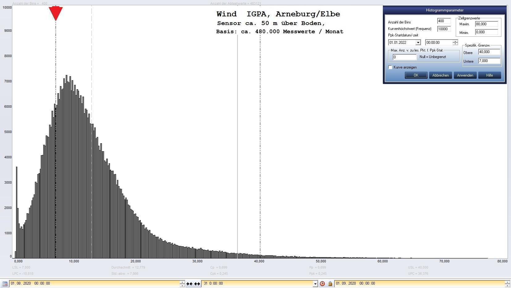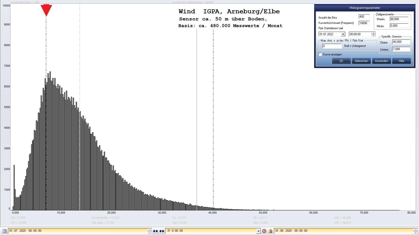 Arneburg Histogramm Winddaten Monat Juli 2020,
