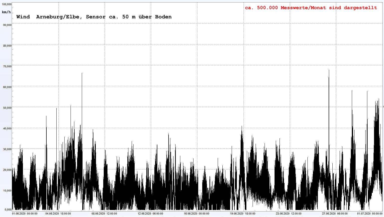 Arneburg Winddaten Monat Juni 2020, Sensor auf Gebäude, ca. 50 m über Erdboden, 5s-Aufzeichnung